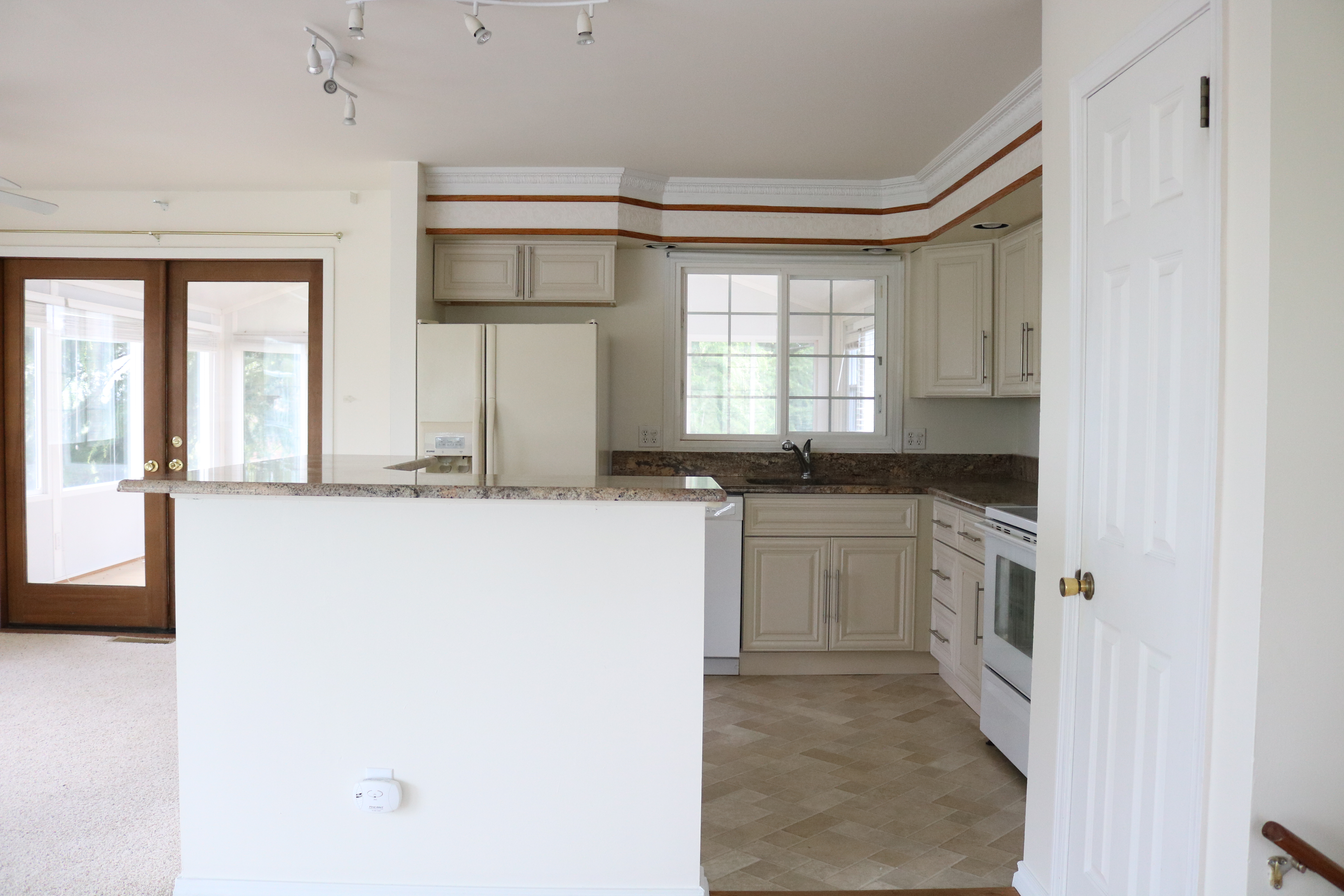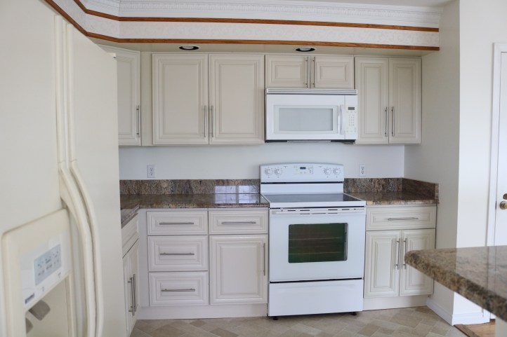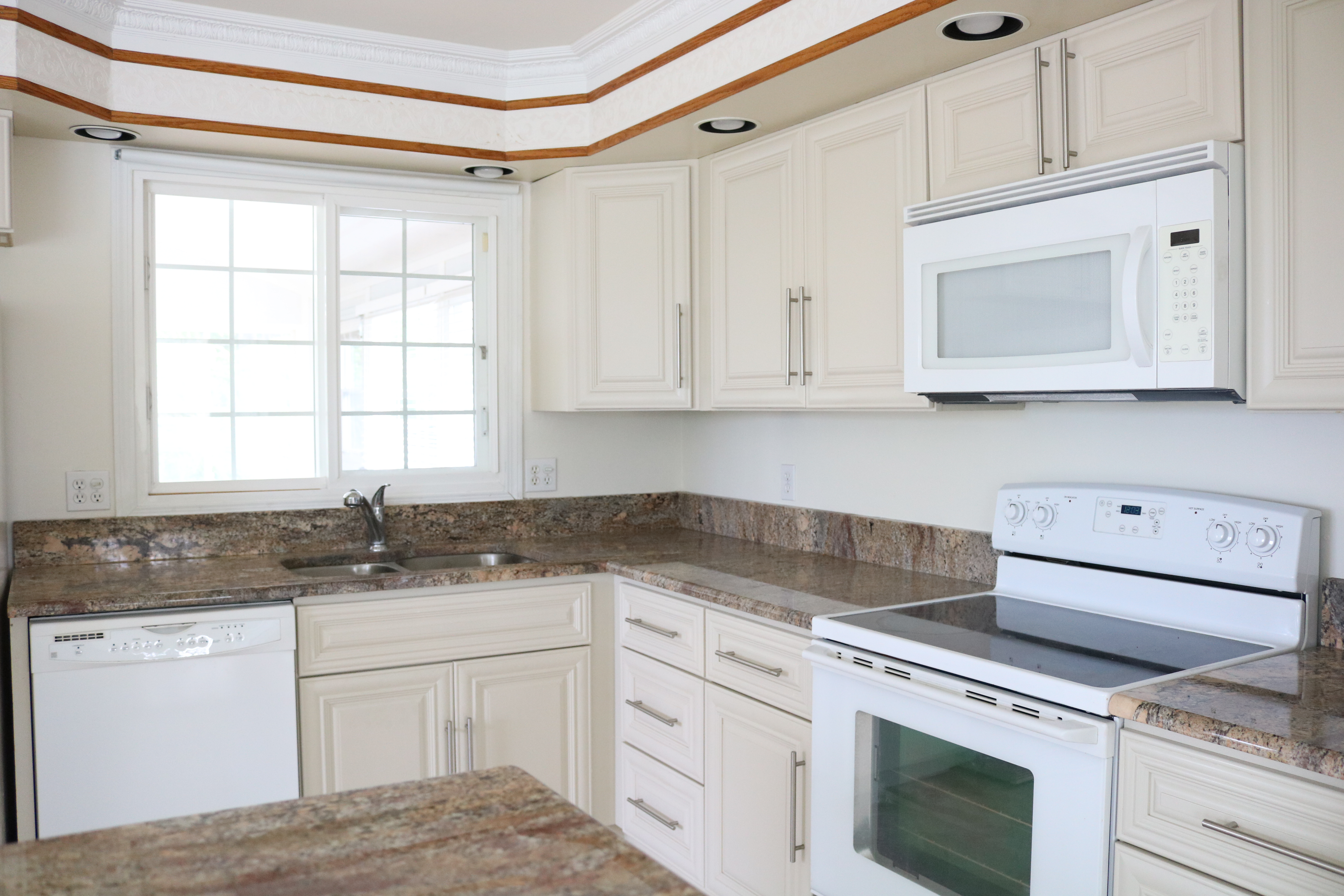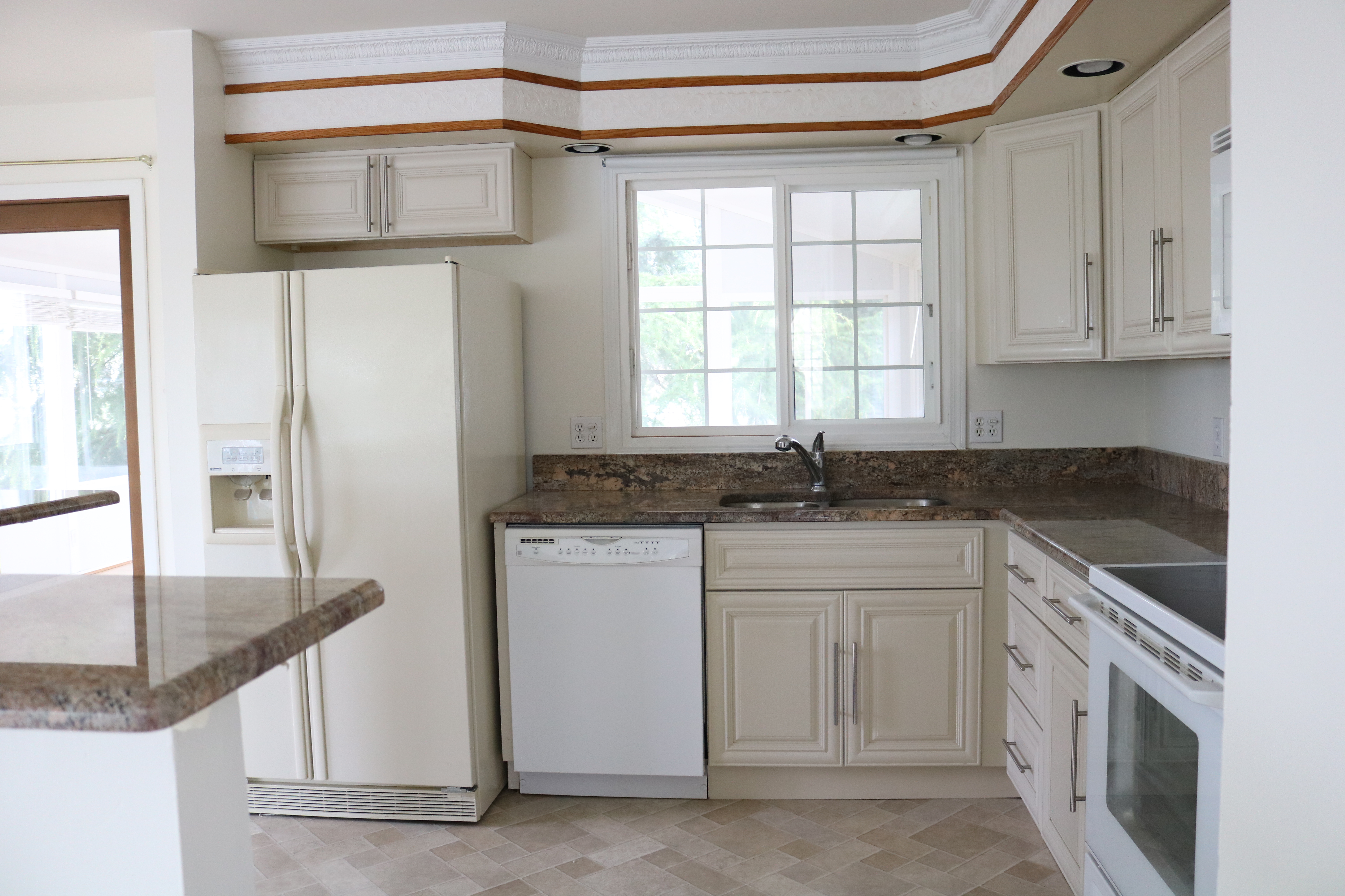 Next up is the kitchen. We for sure knew we wanted to change out the appliances and remove the island, but after lots of convincing (you can take a guess on who tried to convince who), we also decided to switch out the cabinets and countertop. Upon knocking down the island (that is shaped in an L), we found out that the island used to be walls! We assume the previous owner probably wanted to open up the kitchen area and just sliced the walls in half and slapped a granite piece on top. It actually is a pretty affordable way to open up the space. Oh, and the moulding on top of the cabinets was going to come down too.