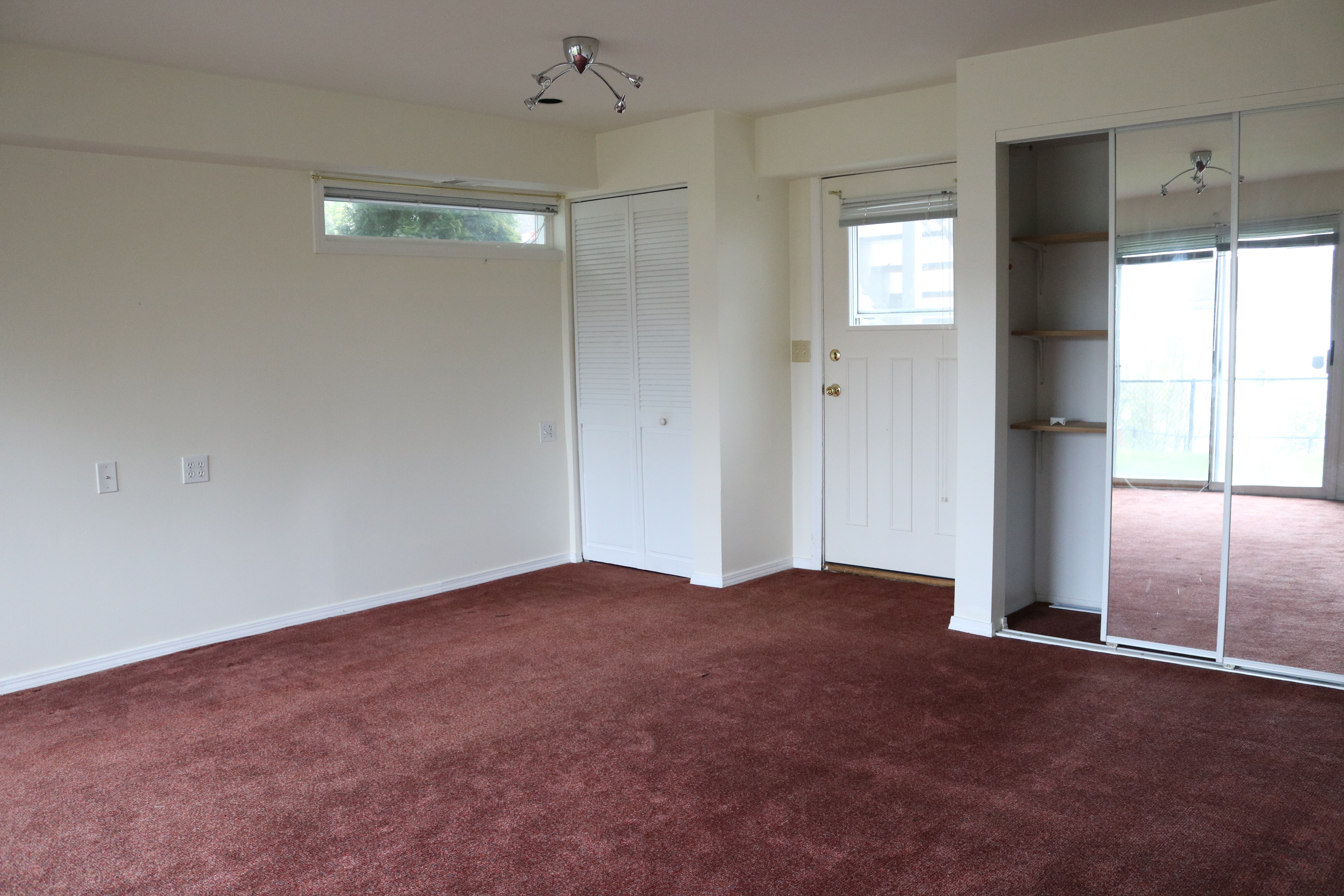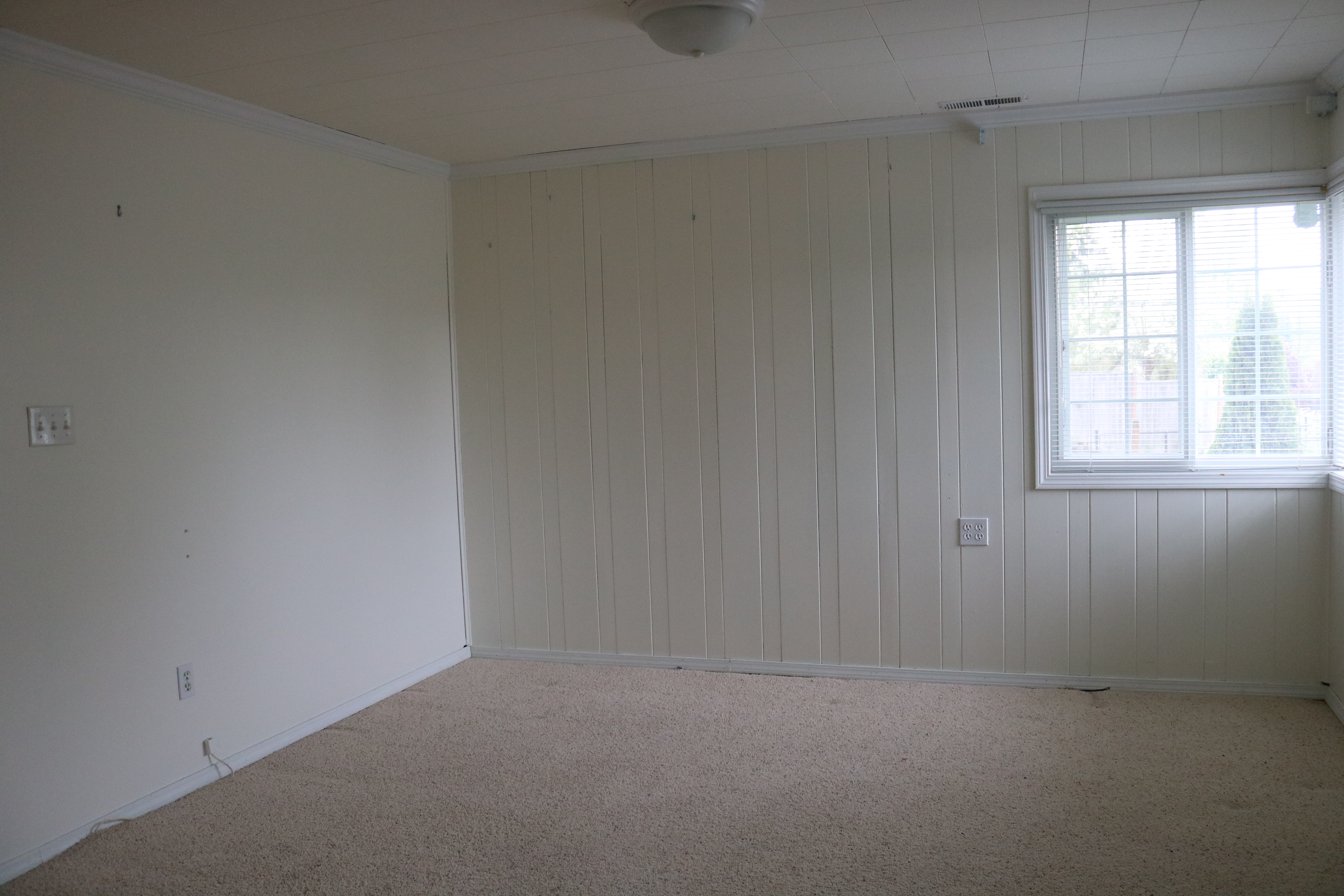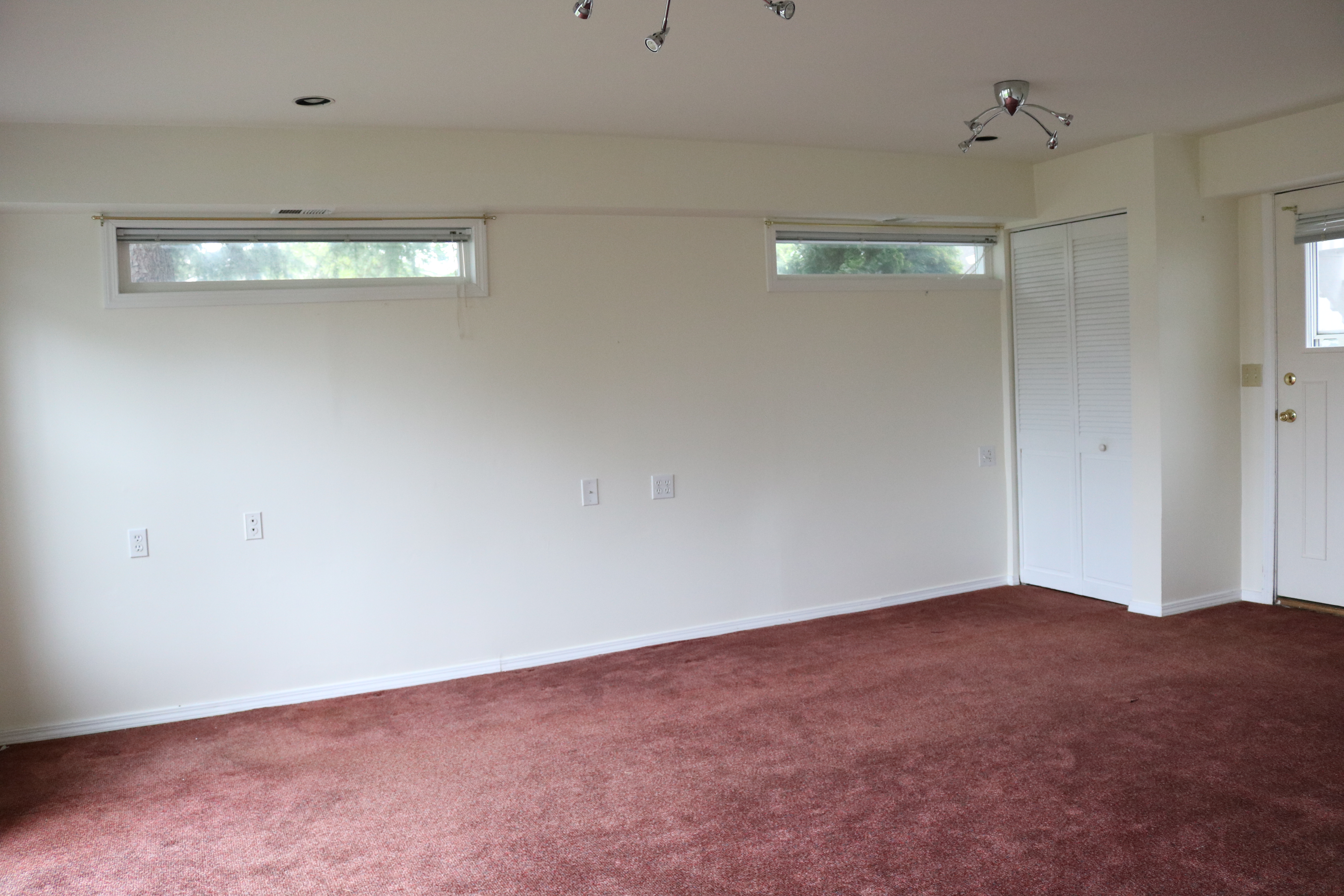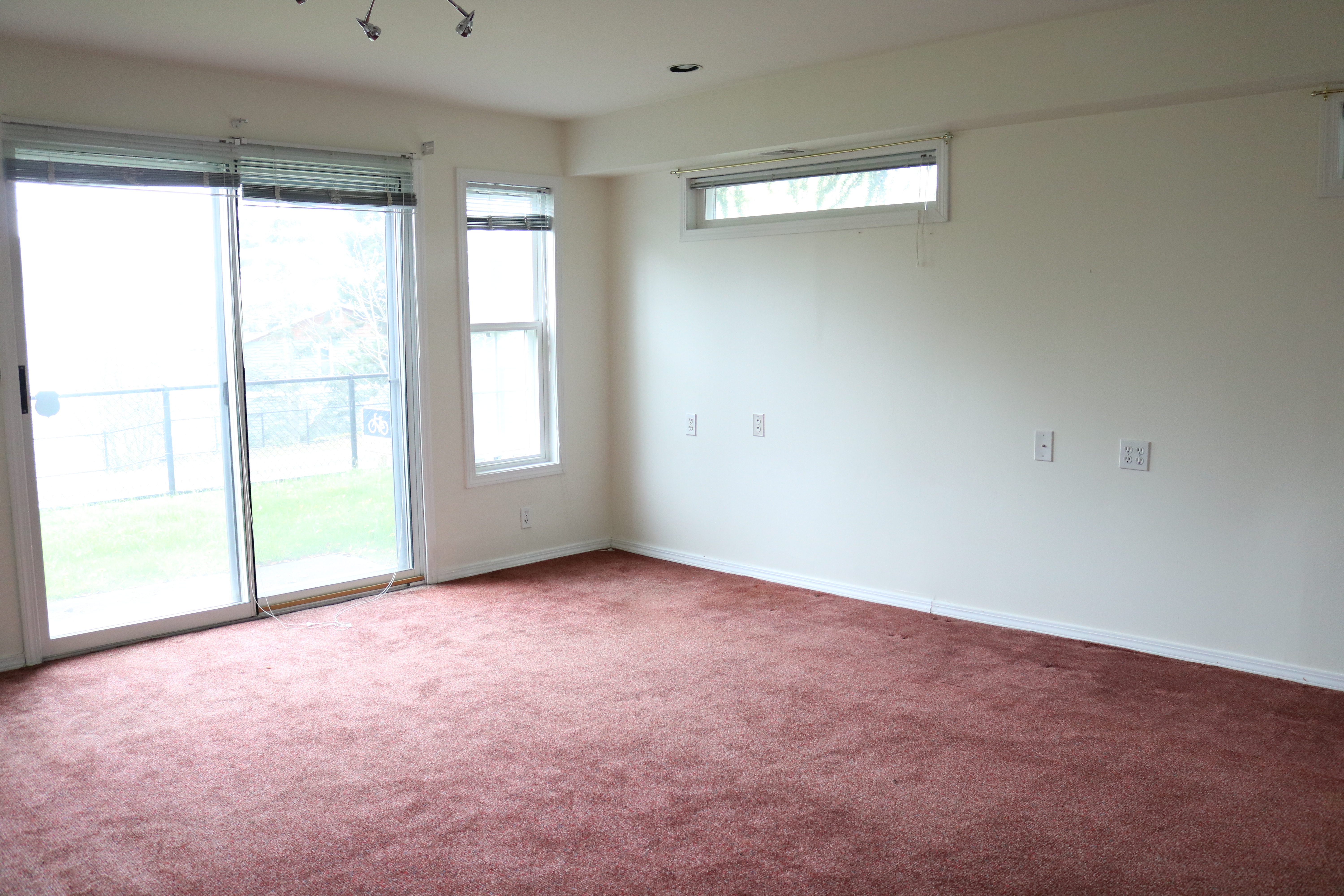 Next to this main living area is a huge rec room that we are turning into a bedroom. There will be new carpet put in, and the alien lights and closet mirrors are coming down. There is a separate entrance down here, as well as glass sliding doors. We are going to leave both for now, but eventually, we may move the door to the main living space, and turn the sliding doors into one big window. Not sure yet, but we will cross that bridge when we get there!