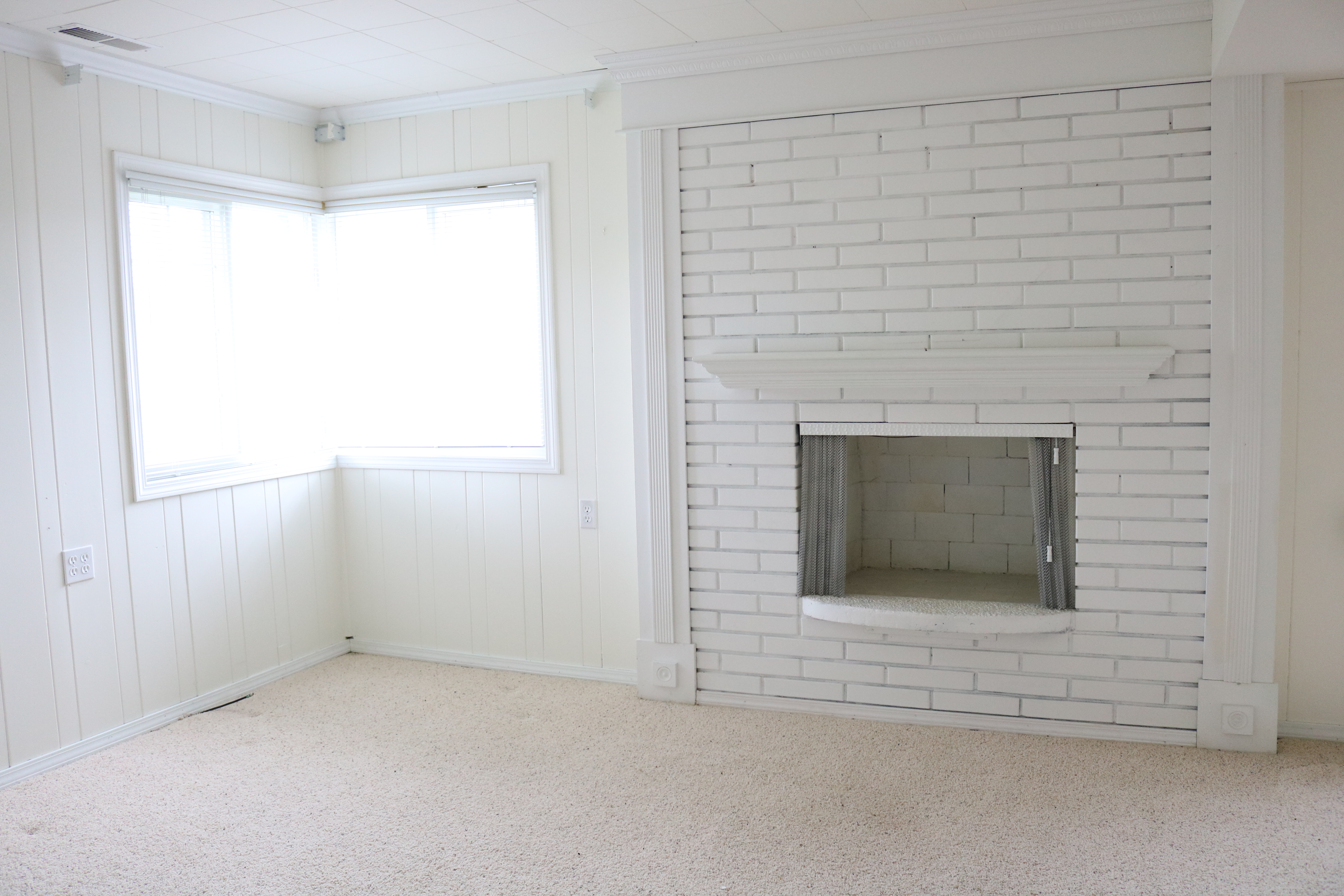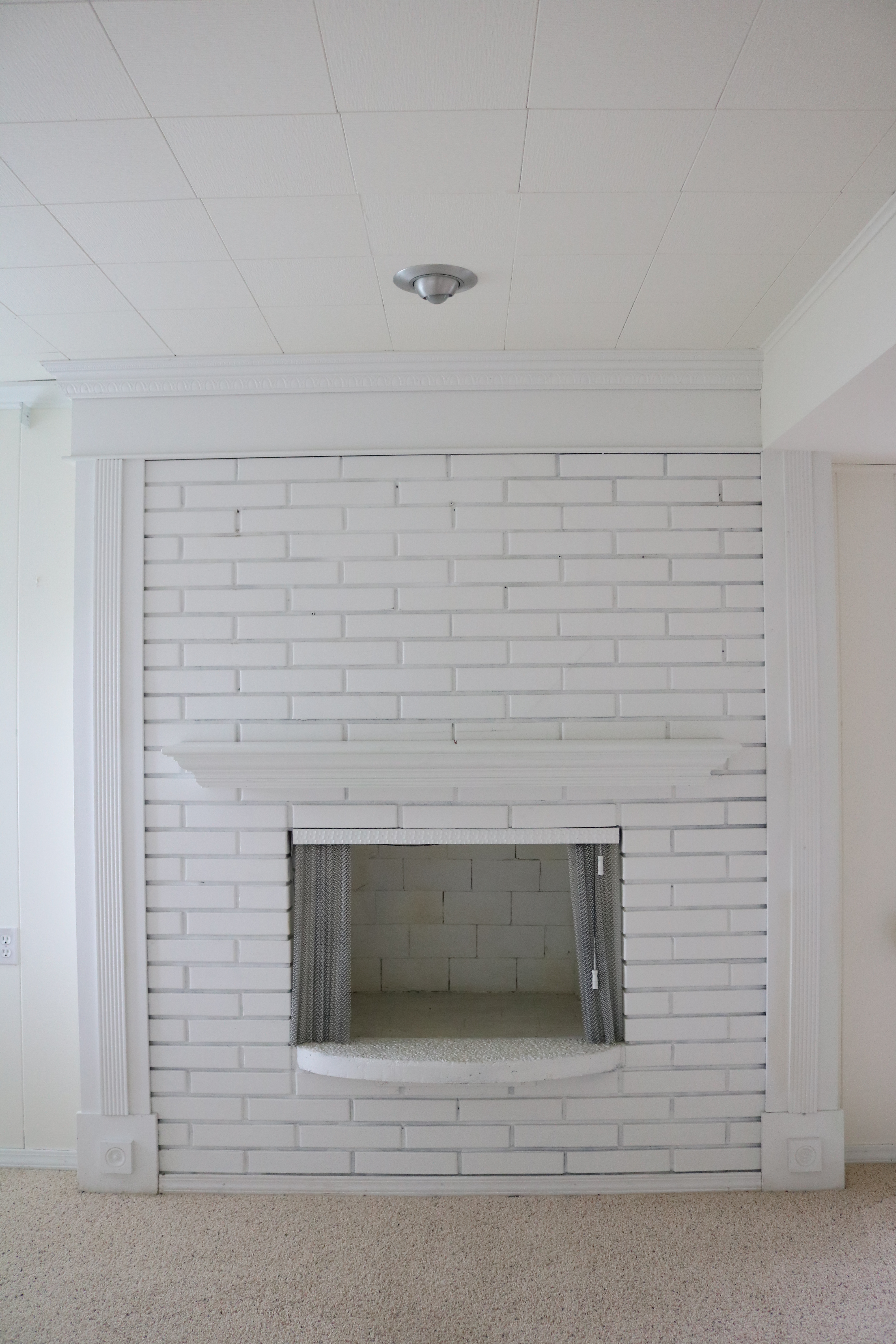 The walls were made of wooden boards, and the ceiling is made up of ceiling tile. We are switching it all out to drywall. The fireplace is also brick, and is connected to the fireplace upstairs. Both are functional! But we will not be using the downstairs one, and I am likely going to paint this one black too!