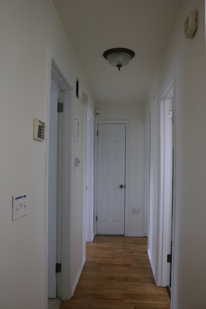 On the main floor, to the right it leads you to a hallway where the three bedrooms and main bathroom are. To the left, you can either go upstairs to the kitchen/living/sunroom, or downstairs to the basement.