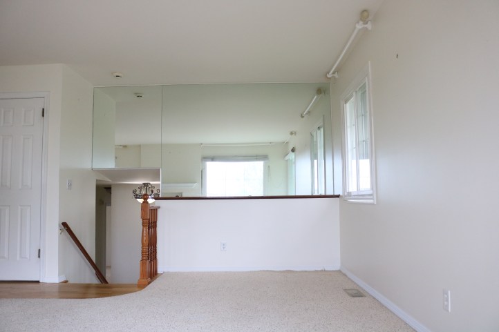 Now let’s take a walk upstairs to the main living area. First we have the living room space. In here, the flooring, railing, and wall color is to be changed. And the mirrors were definitely going down. There are no main lights in the entire living space, so we wanted to add recessed lighting to the entire room (kitchen included). You can catch a sneak peek of the new wallpaper we put up on this mirror wall on my IG!