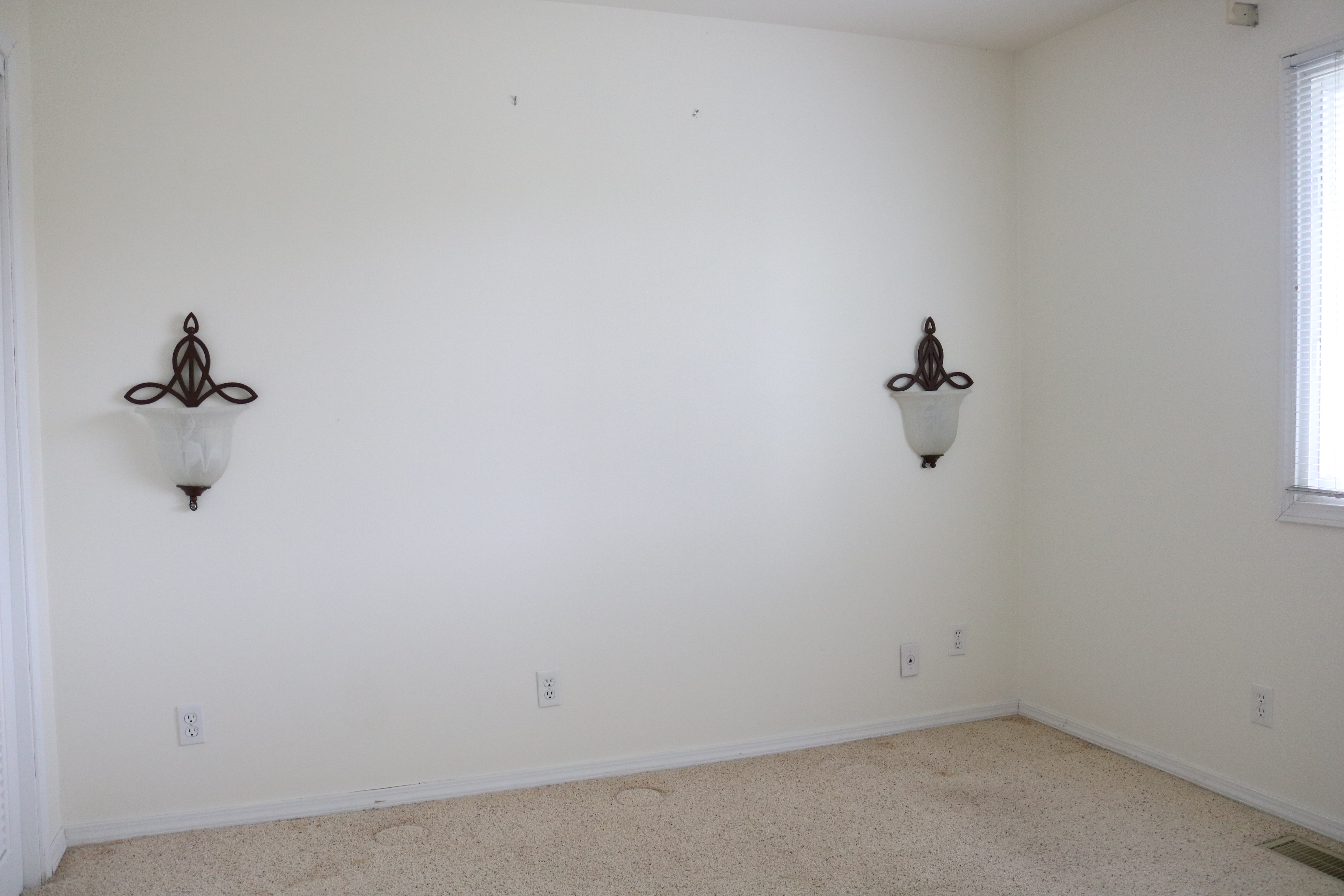 The master bedroom has an ensuite half bath, and a custom closet unit! The floors, sconces, paint color and closet doors were to be updated in here. And, we are adding a fan/ceiling light.