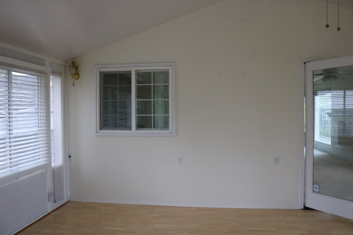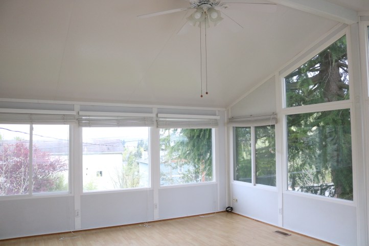 Now to one of my favorite rooms, the sunroom! You may have seen a sneak peek of this on my IG. But really this room is probably undergoing the least amount of change. Because the sunroom was added onto the house (used to be an outdoor deck), it was one of those “kits” you can buy, so the walls are not normal drywall, and are not going to be easy to paint. Only one wall is made of actual drywall, so that wall will be painted, and then the other changes will be new floors and a new ceiling fan.